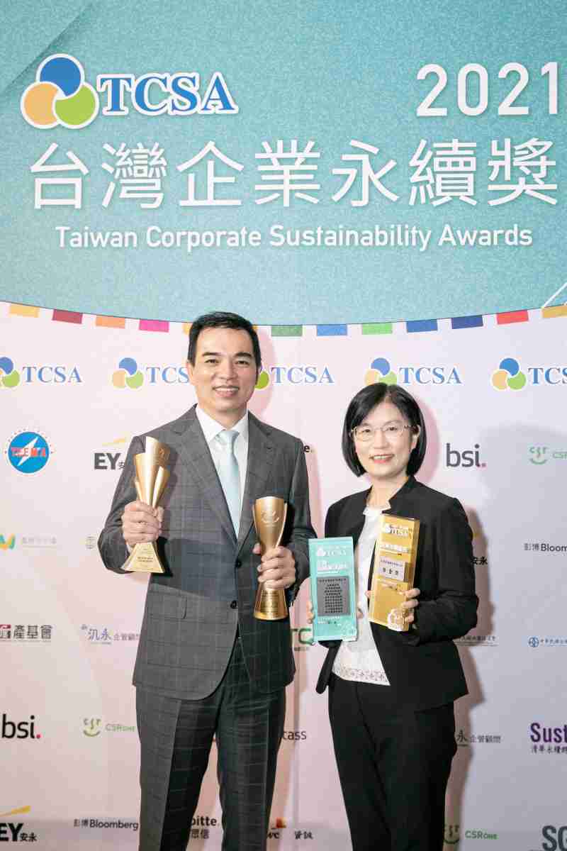 达在台湾永续奖所评比环境、、、社会、、治理等各面向的永续绩效均获高度肯定 (左:尊龙集团光电总经理暨营运长柯富仁,,,,右:尊龙集团光电永续长古秀华)