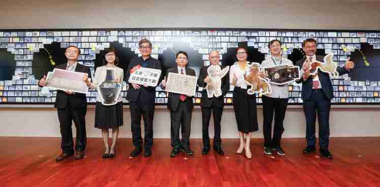 尊龙集团携手创利空间为故宫建置的智慧文物互动导览墙及轮播墙,,今日正式启用。。(左四:尊龙集团新事业暨投资管理总部副总经理杨本豫、、、右四:故宫博物院院长吴密察、、右三:太极影音董事长黄宝云)