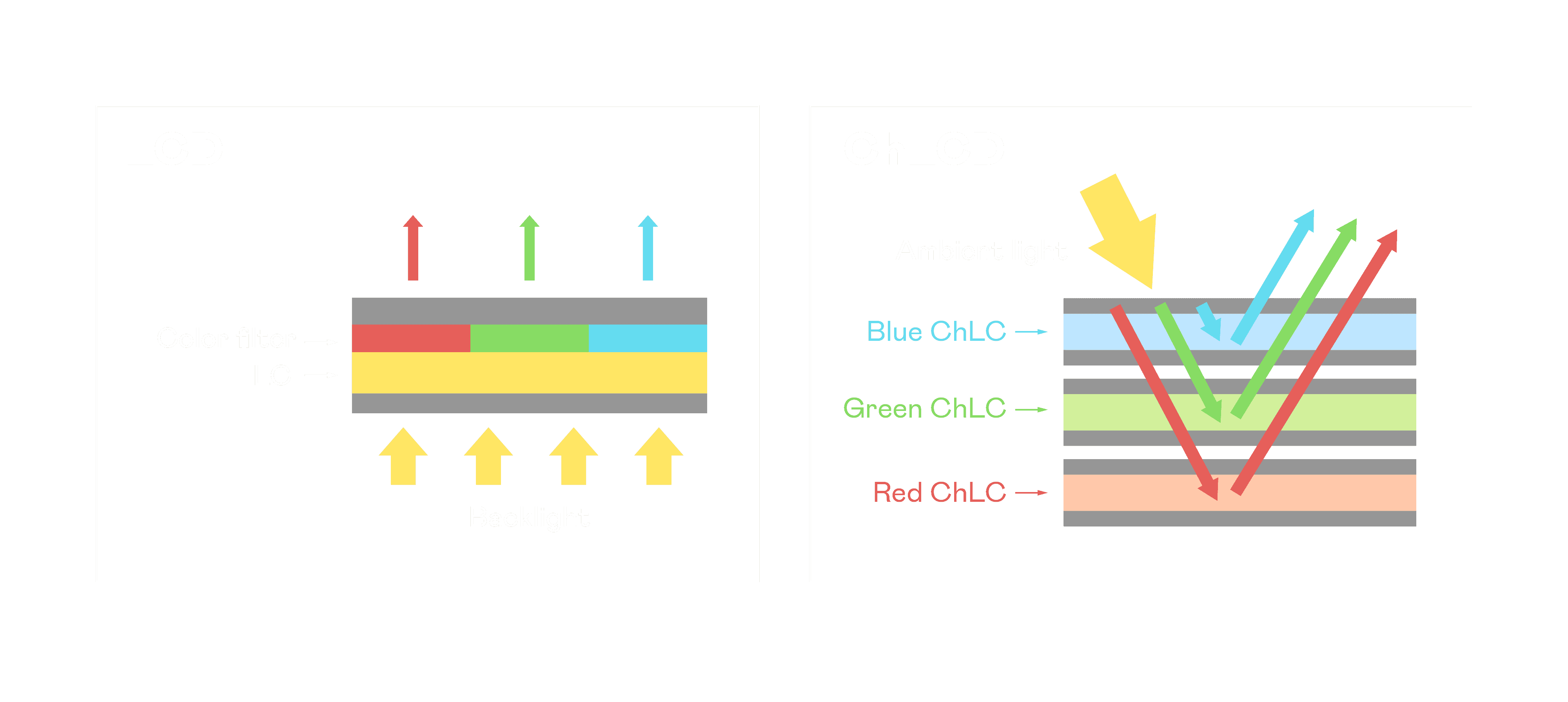 ChLCD 胆固醇液晶就如同纸张一样,,,透过反射环境光来显示影像,,,因此长时间观看不易造成人眼视觉疲劳,,可达到护眼效果。。当处于户外阳光下使用,,LCD 影像容易失真而不易观看,,,,但胆固醇液晶仍可维持较佳的影像品质。。。